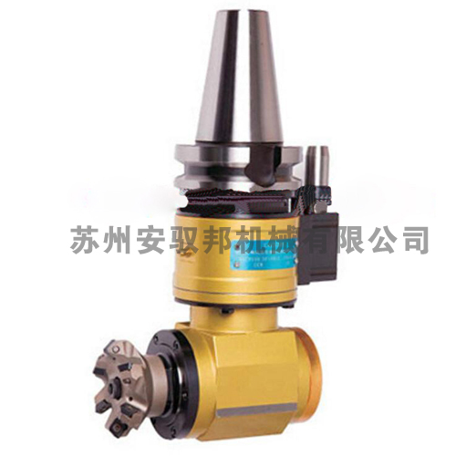 角度頭是一種機(jī)床附件,機(jī)床安上角度頭后刀具旋轉(zhuǎn)中心線(xiàn)可以與主軸旋轉(zhuǎn)中心線(xiàn)成角度加工工件。原產(chǎn)于歐洲,現(xiàn)已廣泛應(yīng)用于航空、汽車(chē)、模具等機(jī)械加工的各個(gè)領(lǐng)域。使用角度頭,無(wú)需改變機(jī)床結(jié)構(gòu)就可以增大其加工范圍和適應(yīng)性,使一些用傳統(tǒng)方法難以完成的加工得以實(shí)現(xiàn),并能減少工件重復(fù)裝夾,提高加工精度和效率。主要用于立式或臥式加工中心、鏜床、龍門(mén)銑床等,其中輕型可以裝在刀庫(kù)中,并可以在刀庫(kù)和機(jī)床主軸之間自由轉(zhuǎn)換;中型及重型擁有較大的剛性和扭矩,可適用于重切削加工需求。因角度頭擴(kuò)充了機(jī)床的使用性能,相當(dāng)于給機(jī)床增加了一根軸,甚至在某些大型工件不易翻轉(zhuǎn)或是高精度要求的情況下,比第四軸更實(shí)用。 FM型面銑刀專(zhuān)用小型90度直角銑頭它的特點(diǎn)是具備傳統(tǒng)角度頭的特點(diǎn),本體與角度頭可360度自由回轉(zhuǎn);可直接連接面銑刀,加工快速穩(wěn)定;可自動(dòng)換刀,是提高效率、批量生產(chǎn)必備的工具。